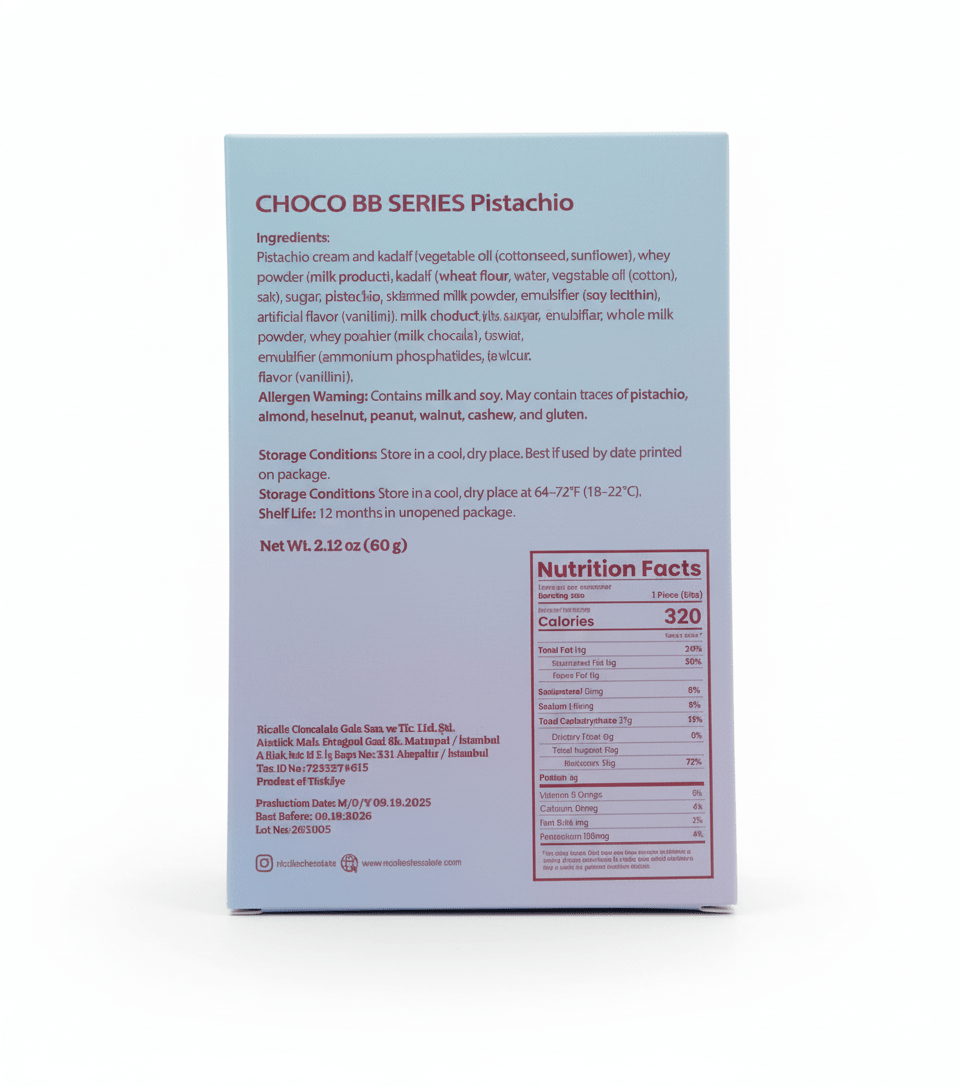 - Trendiges Dessertkonzept: Nutzen Sie die weltweite Beliebtheit von Nahost-Desserts und Gourmet-Schokoladen mit Pistazienfüllung. Dieser Riegel ist ein garantierter Verkaufsschlager für ethnische Lebensmittelhändler und den Mainstream-Handel gleichermaßen.