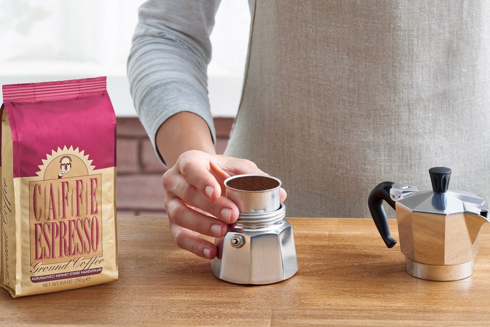 2) Geben Sie 18-20 Gramm gemahlenen Espresso in den Filterteil der Moka-Kanne und schütteln Sie ihn vorsichtig, um ihn gleichmäßig zu verteilen.