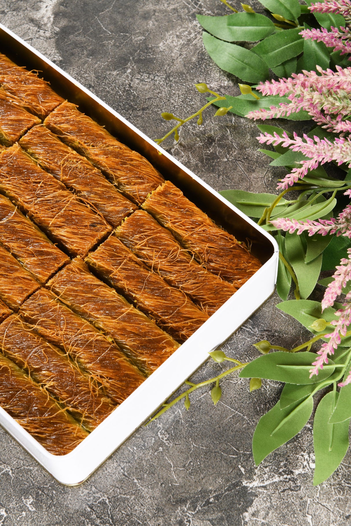 Zutaten (Allergiewarnung): Spezialmehl für Kadayif, geklärte Butter (pflanzliches Öl), Sonnenblumenöl, Trinkwasser, Salz, Kristallzucker, Zitronensaft und Pistazien (grau-grüne Pistazien).