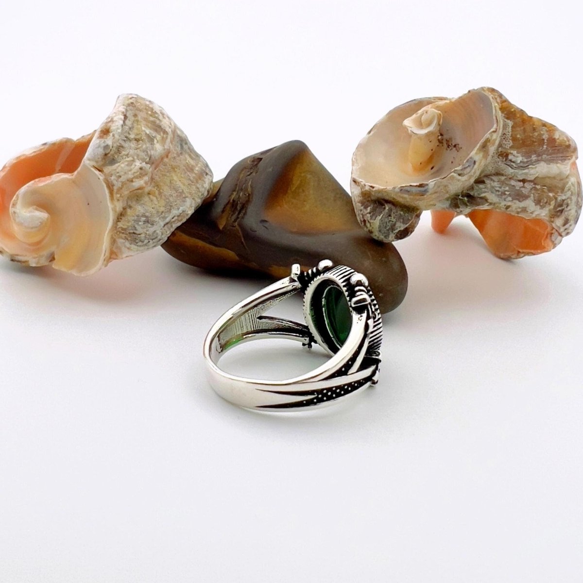 - Verfügt über einen lebhaften grünen Smaragdstein mit Schwert-Detaildesign.