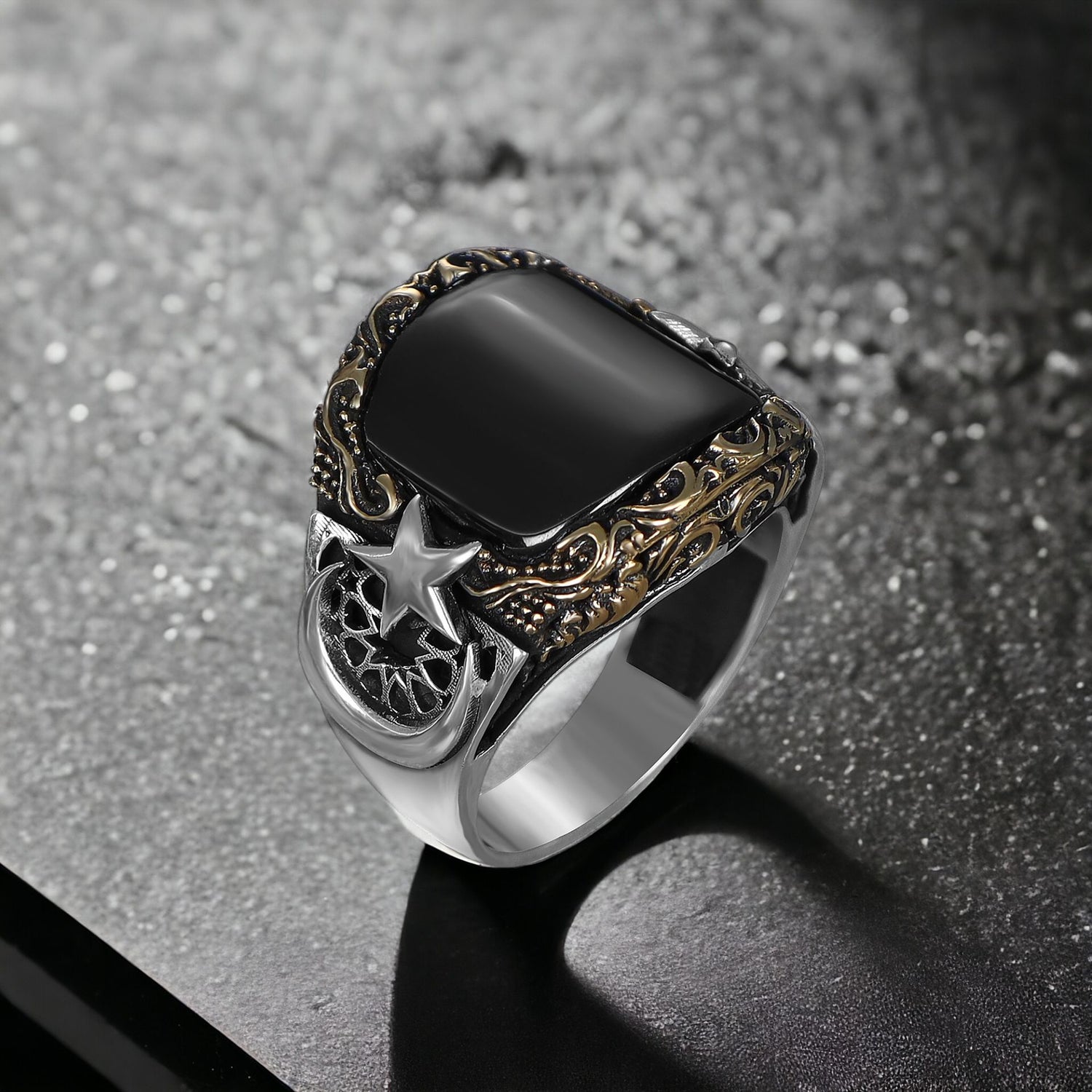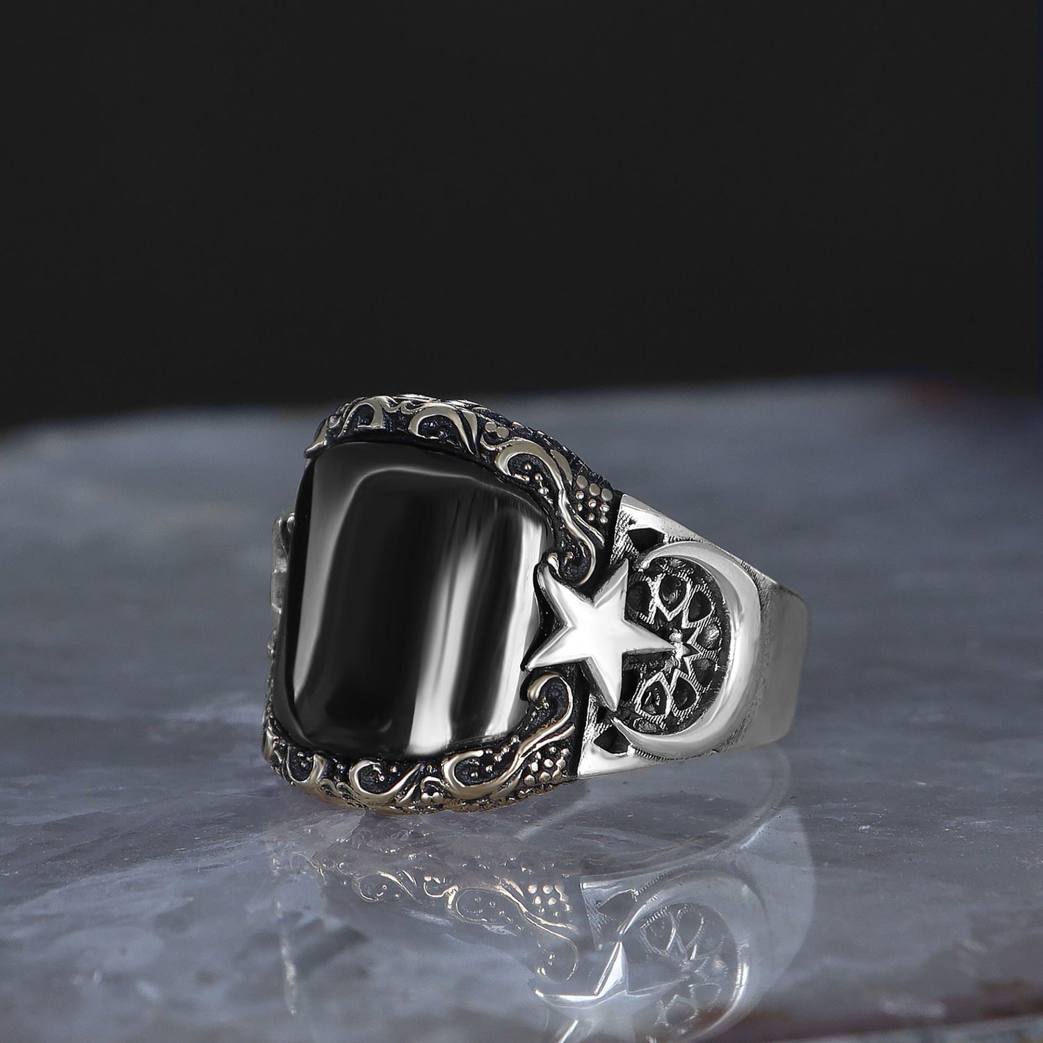 Tesbihevim | Herren Silber Onyx Stein Halbmond Modell Herren Silberring