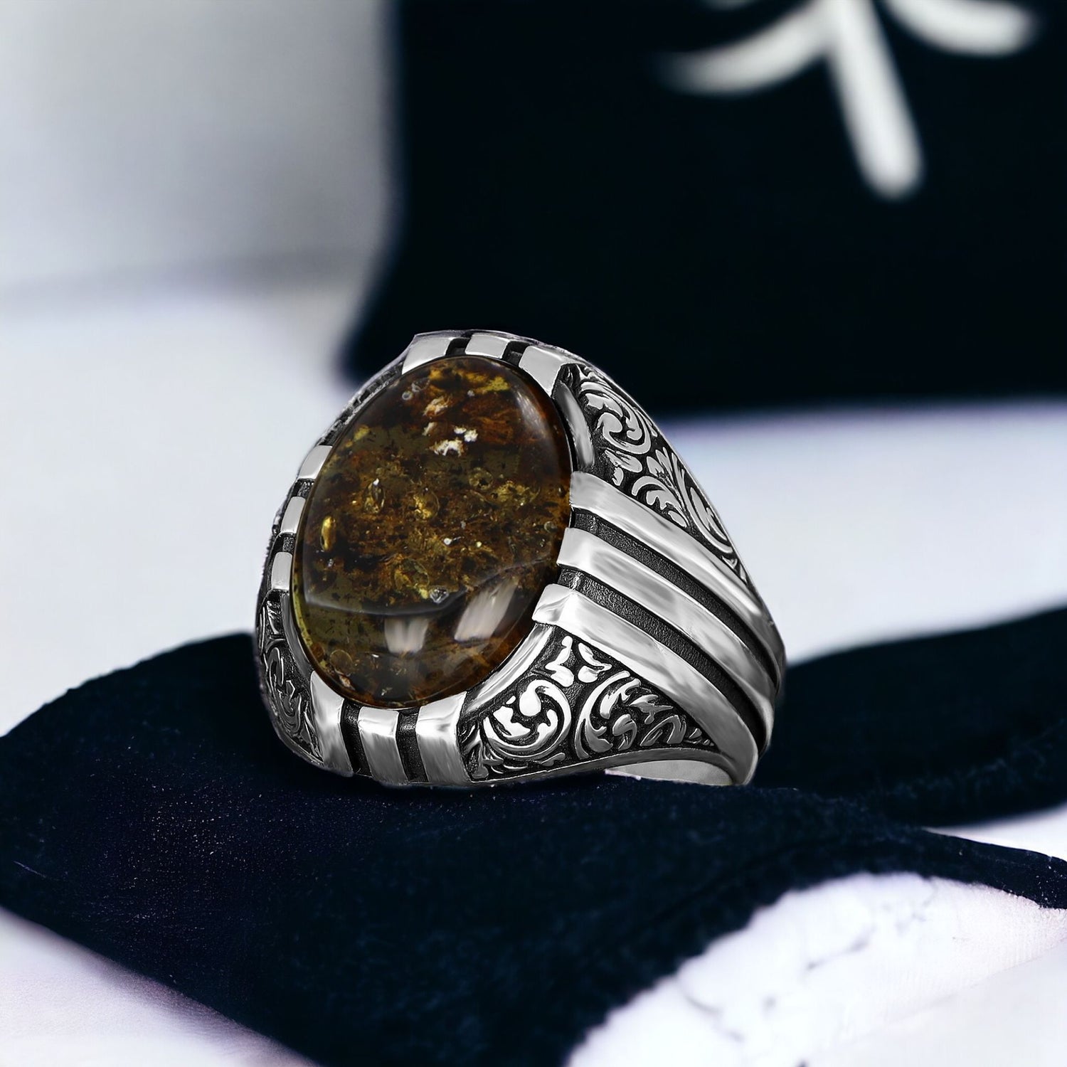 Tesbihevim | Herren Silberring mit fossilem Bernsteinstück