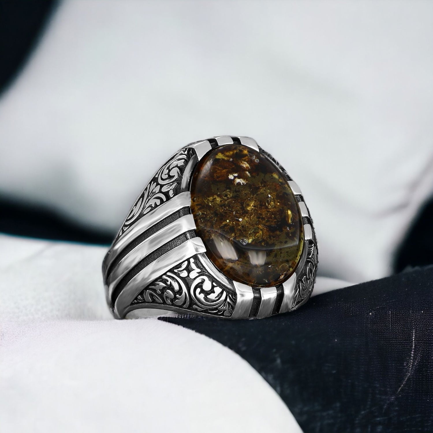 Eleganz trifft Tradition mit Herren-Silberring mit fossilem Tropfen-bernsteinstein