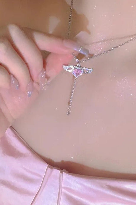 Taki | Pink Stone Damen Edelstahl Halskette mit beweglichem geflügeltem Herzen