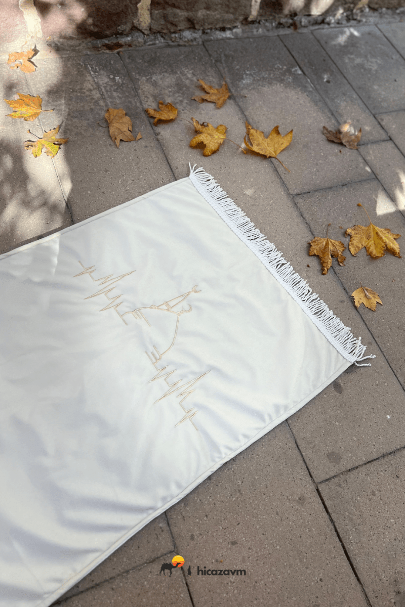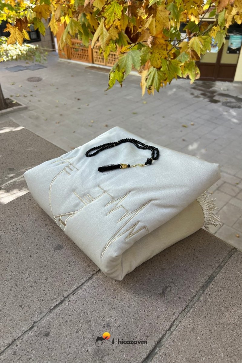 Bereichern Sie Ihr Gebetserlebnis mit diesem cremefarbenen Gebetsteppich mit goldener Stickerei. Genießen Sie das luxuriöse Gefühl und das makellose Design dieses friedlichen und tröstlichen Teppichs.