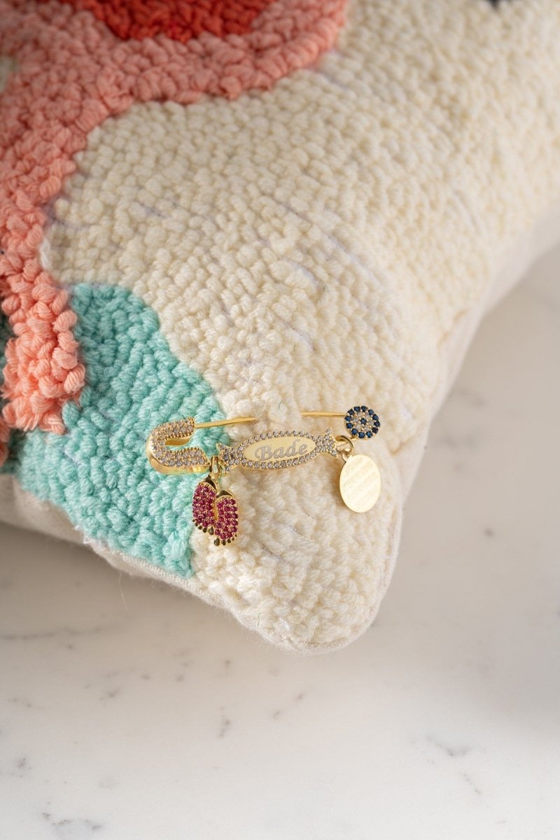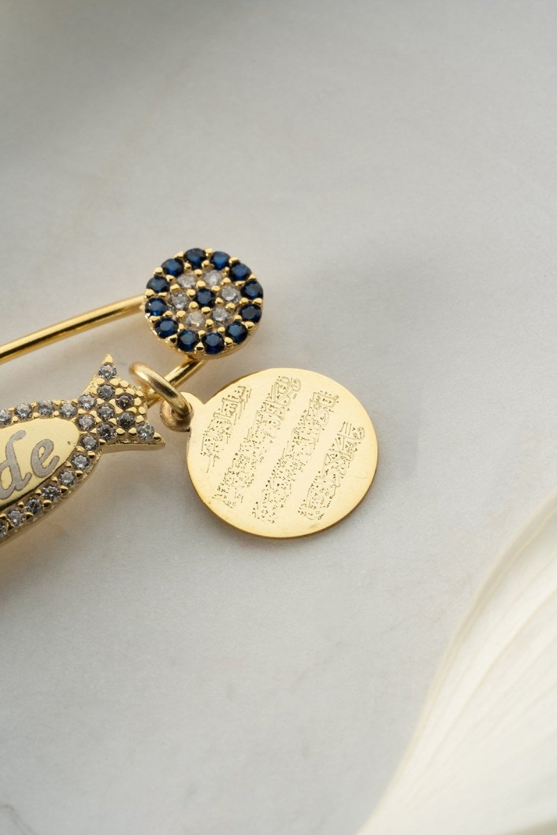 Nereze | Personalisierte rosa Füße Islamisch motivierte Ayatal Kursi Baby-Anstecknadel mit Namen