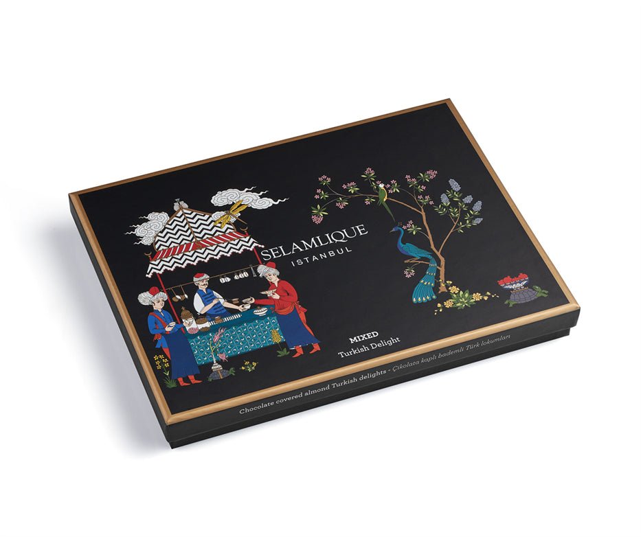 Selamlique bietet luxuriöse und ungewöhnliche Geschmäcker von Türkischem Honig, wie authentischen Mandel-Türkischen Honig, der mit Rosen- oder Orangengeschmack oder mastixgeschmackiger weißer Schokolade überzogen und mit Goldstaub bestreut ist.