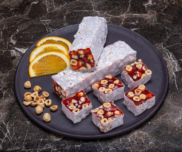 Genießen Sie den exquisiten Geschmack von Hafiz Mustafa's Türkischem Honig mit Orange-Haselnuß-Croquant. Diese luxuriöse Leckerei vereint das spritzige Aroma von Orange mit dem befriedigenden Crunch des Haselnuss-Croquants und schafft eine perfekte Harmonie von Aromen und Texturen. Bekannt für seine köstliche Kaubarkeit, bietet dieses traditionelle Türkische Vergnügen ein süßes und erfrischendes Erlebnis, ideal für diejenigen, die innovative, aber authentische Süßigkeiten schätzen.