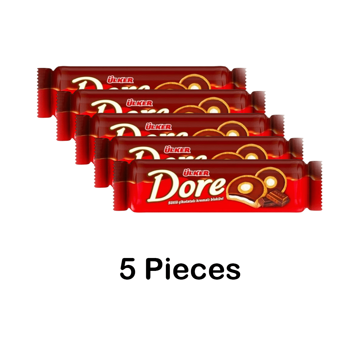- Genießen Sie die Dore-Kekse von Ülker, die eine Mischung aus Zartbitter-Schokolade und Milchcreme enthalten.