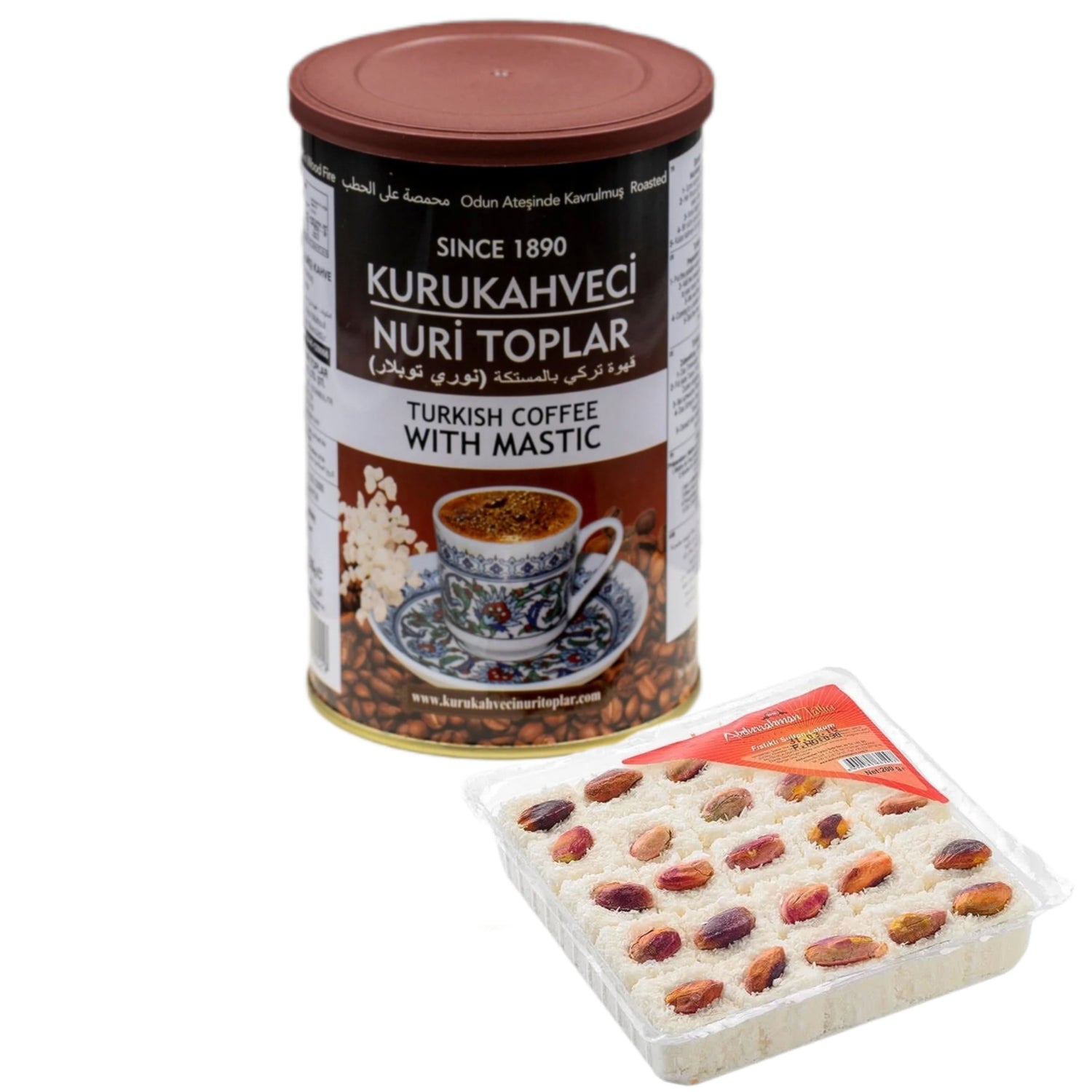 Genießen Sie die reichen Aromen der Türkei mit unserem exquisiten Kaffee & Genuss Bundle, das den feinsten Nuri Toplar Mastix Türkischen Kaffee und köstlichen Weißen Türkischen Genuss mit Pistazien enthält.