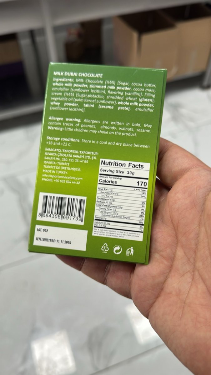Dieses Meisterwerk verfügt über eine dicke, großzügige Schicht aus seidiger Pistaziencreme, die mit reichhaltigem, nussigem Geschmack begeistert. Diese glatte Füllung ist gefüllt mit knusprigen, goldbraun gebackenen Kadaif (Kataifi) Stücken, die die charakteristische knusprig-cremige Textur schaffen, die die wahre Dubai Schokolade ausmacht. All dies ist umhüllt von BiDus charakteristischer reicher Milchschokolade.