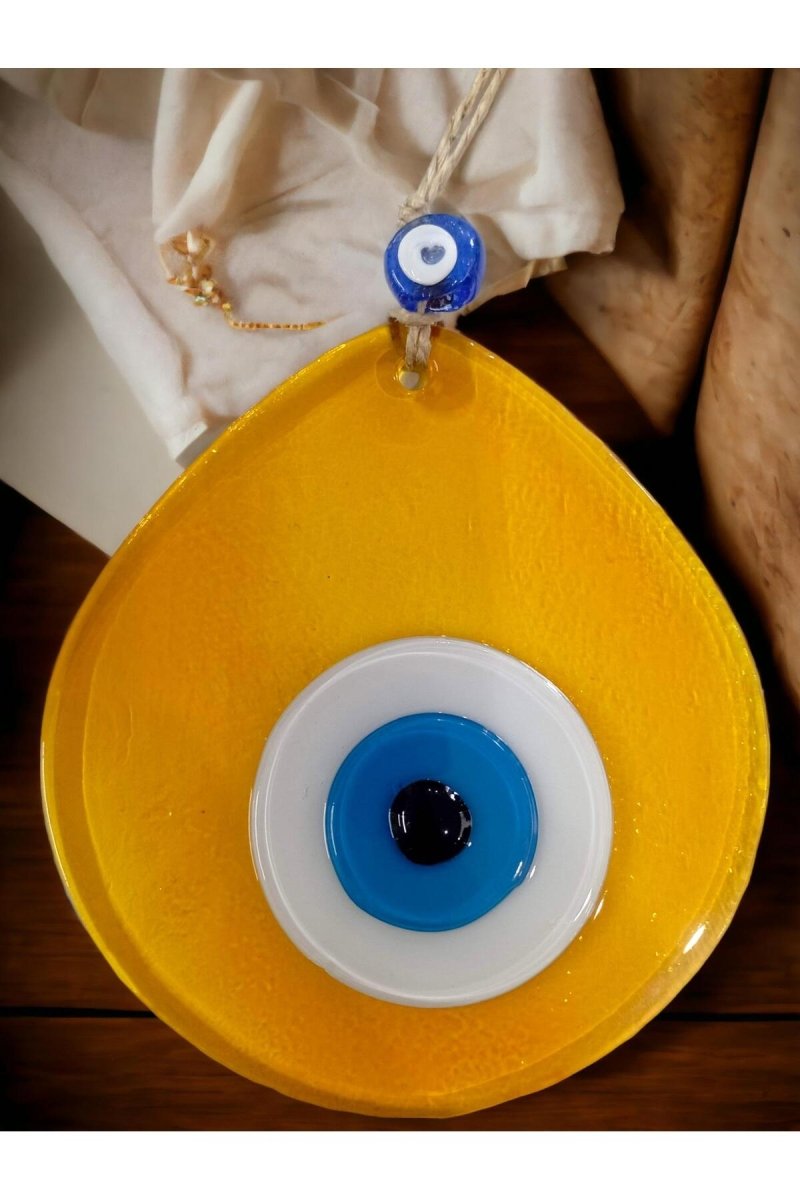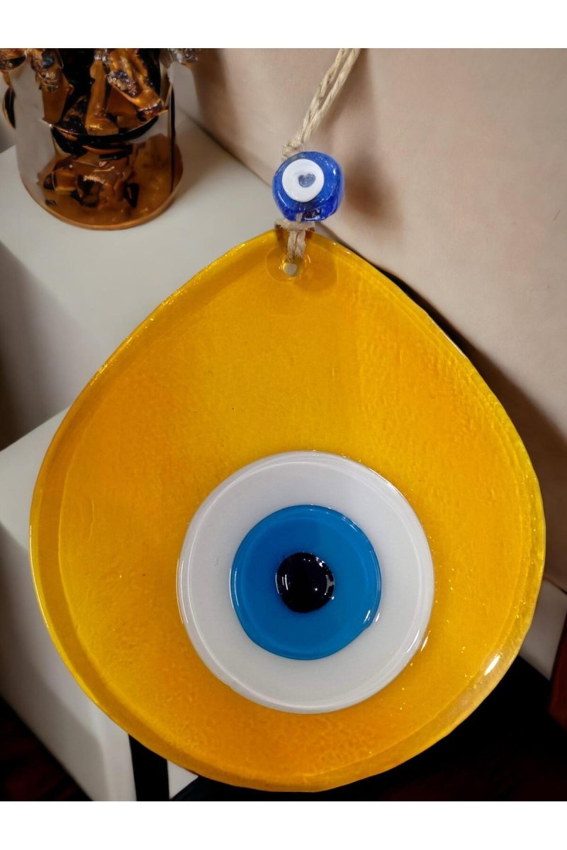 Erheben Sie Ihren Wohnraum mit dem bezaubernden Blauen Nazar Perlen Transparenten Honigfarbenen Tropfenmuster Handgefertigten Wandornament. Tauchen Sie Ihr Zuhause in den Reiz von Kultur und Stil mit diesem sorgfältig gefertigten Glasmeisterwerk. Das handgefertigte Wandbild, das mit Präzision und Sorgfalt entworfen wurde, zeichnet sich durch filigrane Details aus, die es als Symbol künstlerischer Exzellenz hervorheben.